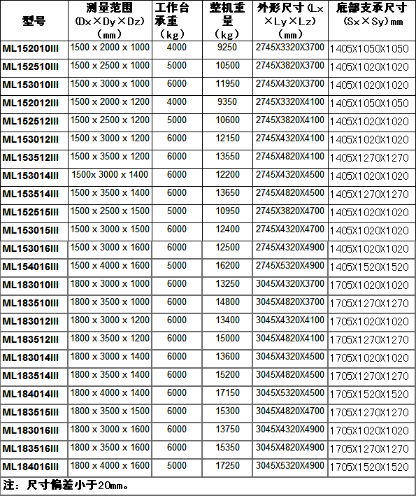 一、****系列三坐标测量机产品简介: ***系列采用高精度精密型测量机的专用结构,由固定桥和移动工作台组成,其牢固的机械结构确保了系统具备较大的刚性、较佳的稳定性和较小的振动,保证了 整个测量空间极高的测量精度。配以测量软件包,使其成为同类机型中性价相比当高的产品,其将满足您的需求,为您提供一个完善的测量解决方案。 MGH 系列三坐标测量机采用封闭框架结构设计,是高精度精密型测量机的专用结构。由固定桥和工作台移动组成,其牢固的机械结构确保了系统具备较大的刚性、较佳的稳定性和较小的振动,保证了整个测量空间极高的测量精度。二、***系列三坐标测量机产品特点: 1、三轴在机械上相互独立,运动互不干扰,从而确保了系统的高稳定性。 2、Y 轴运动采用中央驱动,避免了 Y 向运动中的偏摆,提高了 Y 轴的运动精度。 3、Y 轴导轨采用燕尾槽定位方式,以保证运动时的较大刚性及精度。 4、三轴导轨均采用优质花岗岩,使三轴具有相同的温度特性,因而具有良好的温度稳定性、抗实效变形能力,钢性好、动态几何误差变形较小。 5、三轴导轨均采用自洁式预载荷高精度空气轴承,运动 更平稳。 6、光栅的布置接近被测工件,遵循了阿贝误差原理,减小了系统误差。 7、驱动系统采用进口高性能直流伺服电机、滚珠丝杠加同步带传动,确保传动更快捷、更精准、运动性能更佳。 8、Z 轴采用气缸平衡装置,极大的提高了 Z 轴的定位精度及稳定性。 9、控制系统采用德国高集成度 SB-08 专用数控系统,从而大大的提高系统的性能、可靠性和抗干扰能力。 10、软件采用具有独立知识产权的、功能强大的 ***** 测量软件包,其完善的测量功能和联机功能,为用户提供了**的测量解决方案。 11、此精度依照 ISO 10360-2 标准及 JJF 1064-2000标准。12、此表机型技术参数为标准配置,可满足客户非标机型的特殊技术及配置要求。13、所有技术指标和规格可能有所变动,不另行通知14、采用高精度精密型测量机的专用结构,由固定桥和移动工作台组成,其牢固的机械结构确保了系统具备较大的刚性、较佳的稳定性和较小的振动,保证了 整个测量空间极高的测量精度三、技术参数:型号 测量范围(mm) 示值误差(mm) 探测误差(μm) 786 700×800×600 1.2+ L/400 1.5 8106 800×1000×600 1.2+ L/350 1.5 10128 1000×1200×800 1.5+ L/350 4.8 121510 1200×1500×1000 1.8+ L/350 2.0